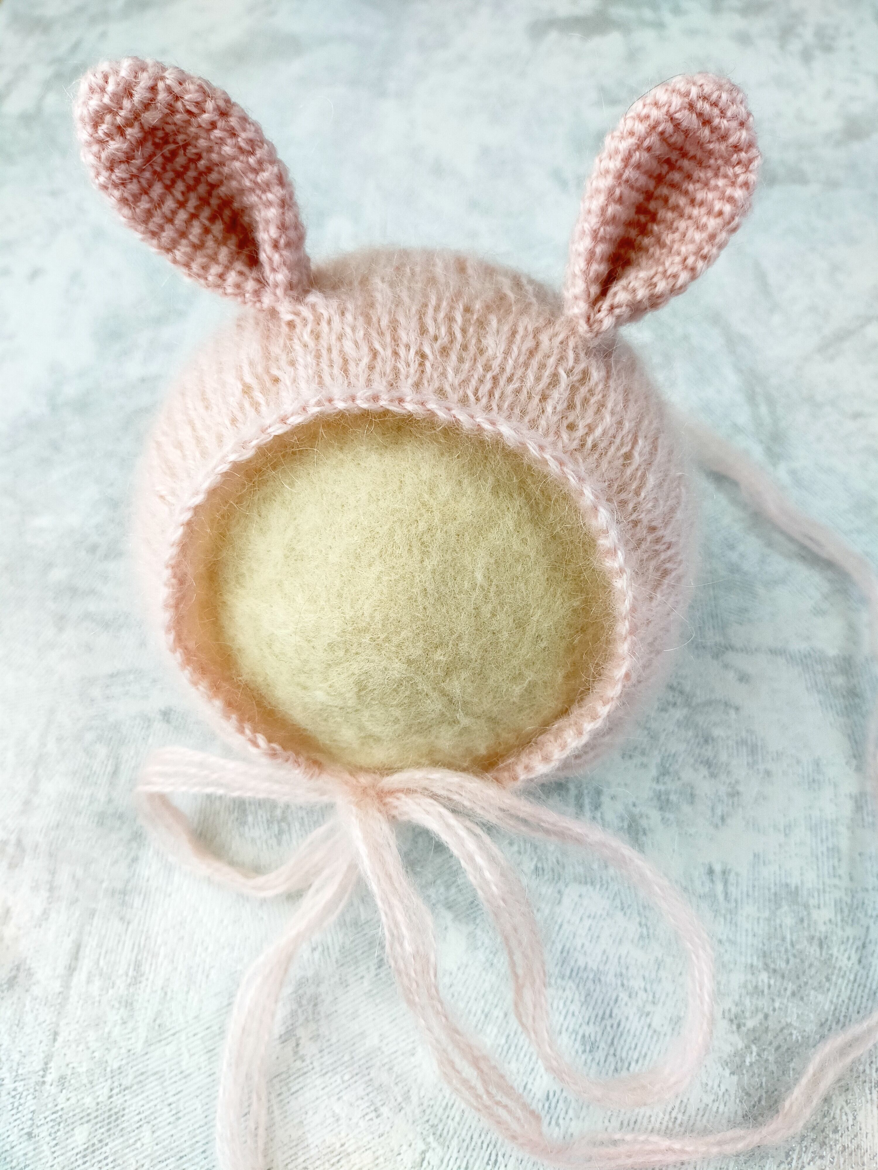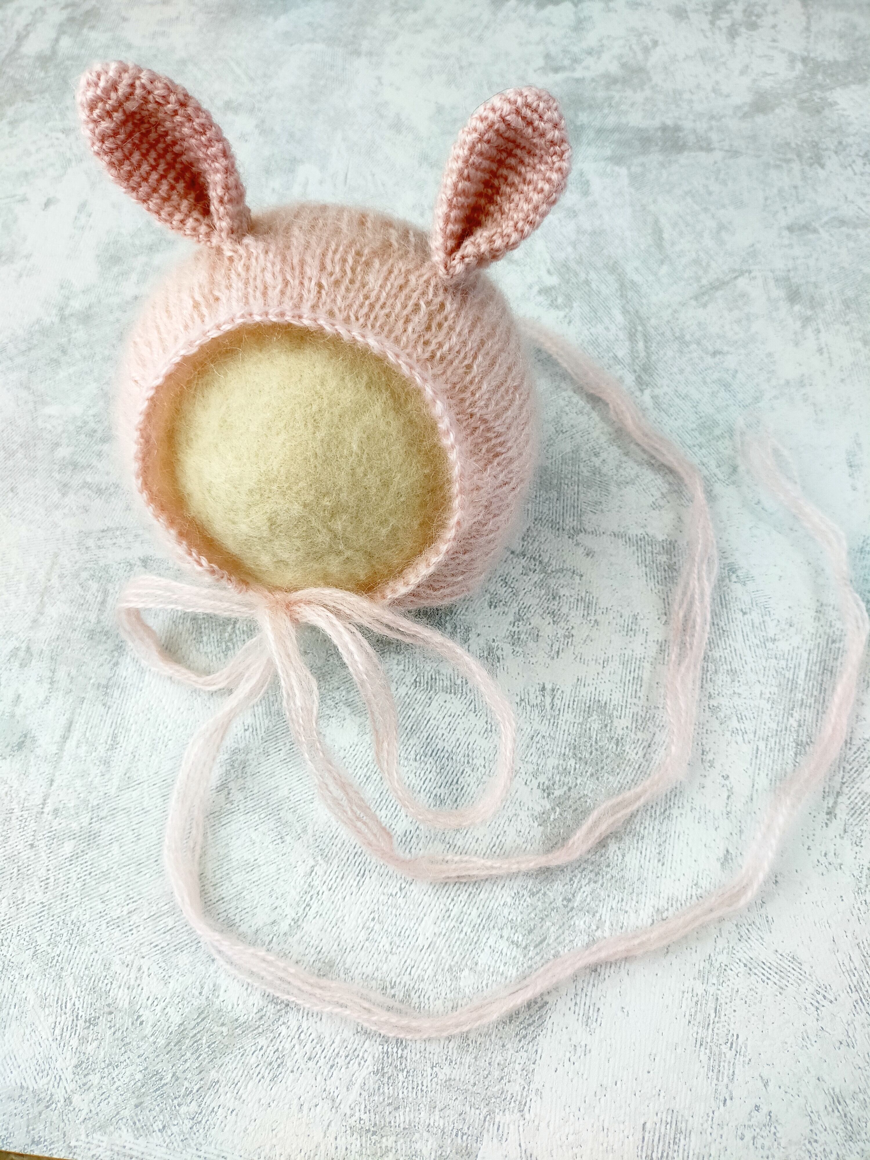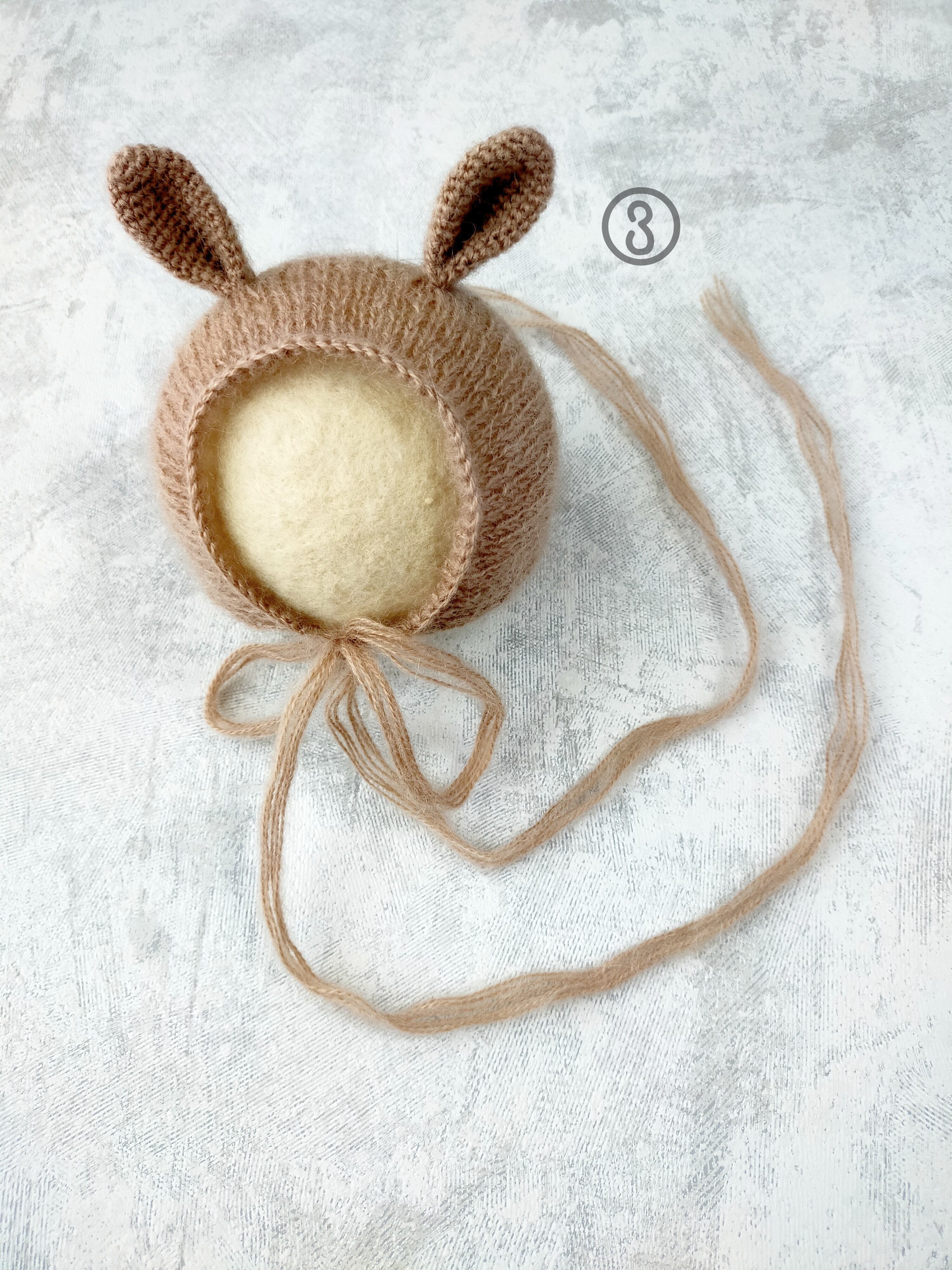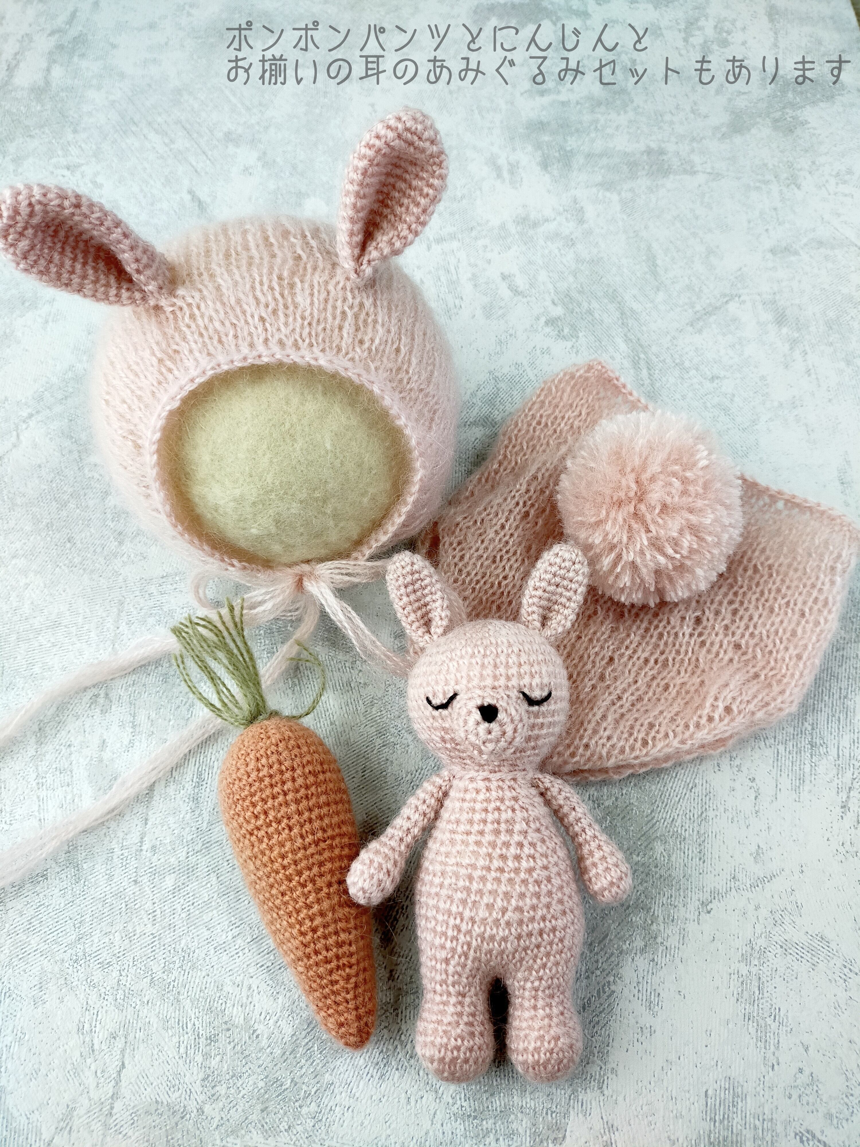○ポンポン付きパンツとにんじんとボンネットとお揃いの立ち耳のあみぐるみの4点セット
